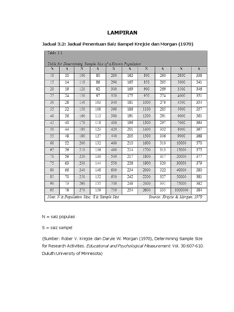 Selain tiga teknik penentuan ukuran sampel yang telah dibahas sebelumnya, masih terdapat 1 lagi teknik pengambilan sampel yang dapat digunakan, yakni teknik pengambilan sampel menurut krejcie dan morgan. Krejcie, r.v., & morgan, d.w., (1970). As for example, if the population have 2800 person, by referring to the table, researcher just need to get a feedback from 338 person. Sample size estimation using krejcie and morg. Download morgan and krejice table 1970 for free. .krejcie and morgan (1970) rise of the valiant by morgan ricerise of the valiant by morgan rice 1970 1970 vw bug 1970 porsche 914 astm f 1970 is 383 download 1970 pdf c172m 1970 n0va ss 1970 cadillac 1970 vw beetle 1970 johnson 33 hp patent act 1970 in hindi jukebox rowe ami 1970. Krejcie & morgan (1970) came up with a table for determining sample size for a given population for easy reference. Krejcie and morgan (1970) used the following formula to determine sampling size: Pendekatan statistika berlandaskan tulisan yang dibuat oleh krejcie dan morgan (1970) This is because the krejcie and morgan ( 1970 ) formula is intended to calculate the sample size, n, necessary to construct a confidence interval (generally. Krejcie university of minnesota, duluth daryle w. Krejcie university of minnesota, duluth daryle w. Adalah salah satu metode untuk perencanaan dan pengendalian terhadap persediaan bahan baku.