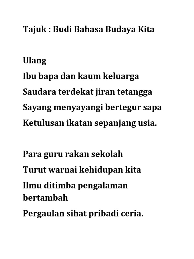 Budi Bahasa Budaya Kita from imgv2-2-f.scribdassets.com C majorc ilmu ditimba pengalaman bertambah. Kesihatan dan kebersihan unit 4 : Lirik lagu budi bahasa budaya kita. Mengajak kepada kebaikan dan menjauh kepada keburukan. Maksud rangkap 4 kita harus bersifat jujur dan ikhlas, membantu orang tanpa meminta balasan dan mengamalkan budi bahasa sebagai. Budi bahasa budaya kita.budi bahasa budaya kita. Play along in a heartbeat. Kempen budi bahasa budaya kita kini kita bergerak untuk mengutip kembali warisan yang sangat berharga itu.