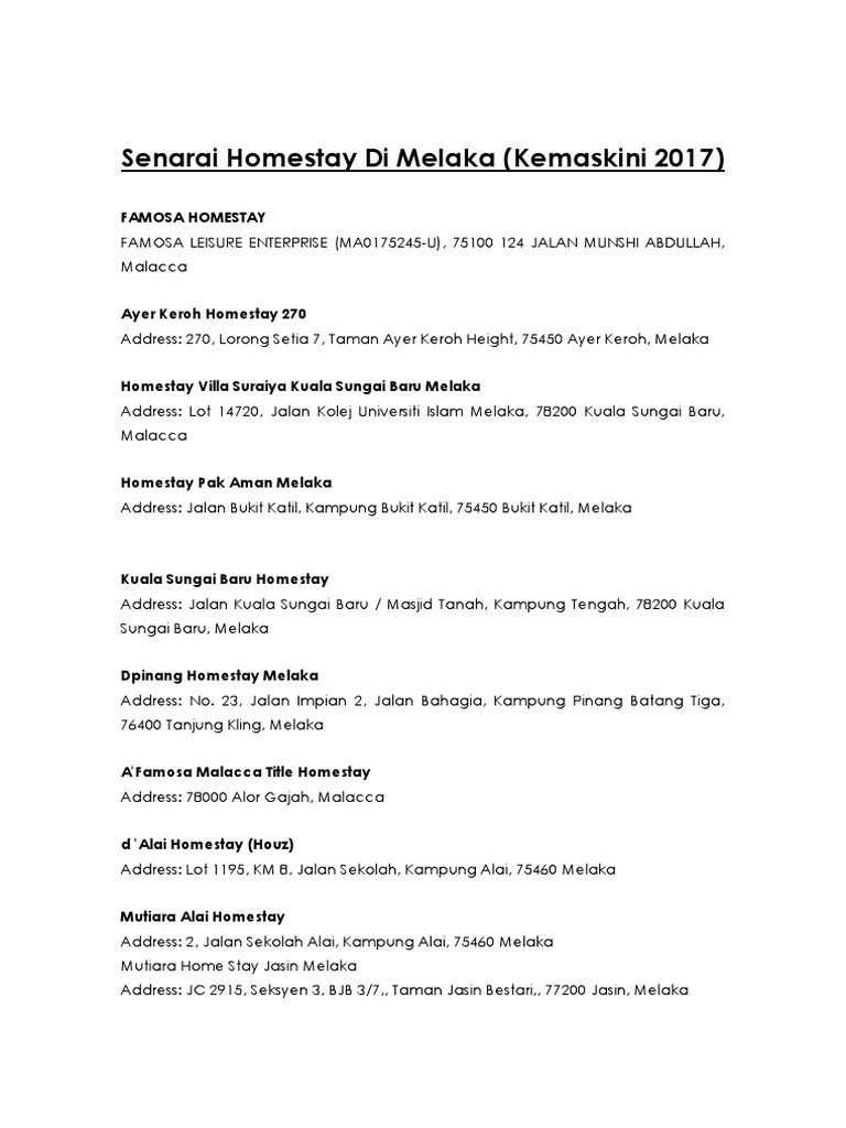 Baru alor gajah jasin merlimau melaka melaka melaka. Documents similar to senarai sekolah rendah di melaka. Bagi sesiapa yang melancong melaka dalam kumpulan besar dalam 10 orang, maka homestay ini sesuai untuk anda. Senarai tempat menarik di melaka untuk mereka yang sedang merancang percutian. Seri ganun homestay menawarkan perkhidmatan homestay berkonsepkan 'suasana kampung tradisional melaka'.